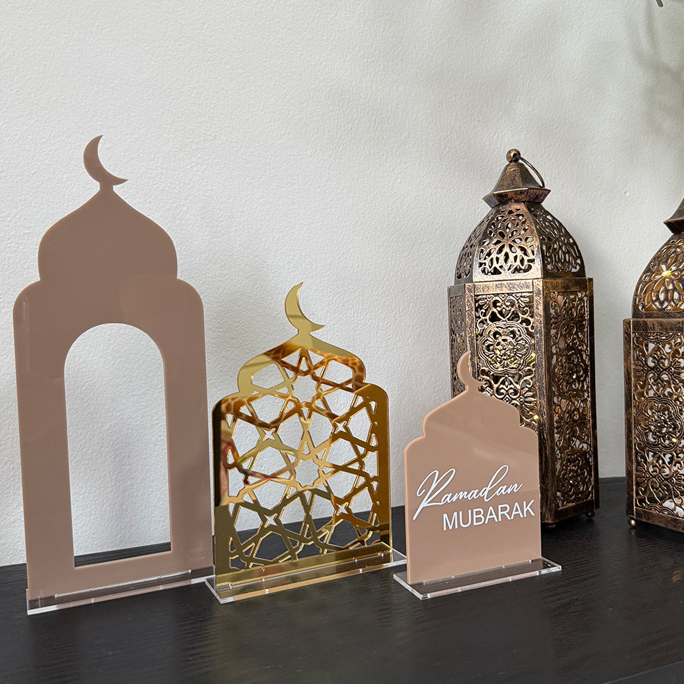 Our freestanding 3pcs Mosque Set is the perfect decor for your table setup or as a sentimental gift. They include a clear base.