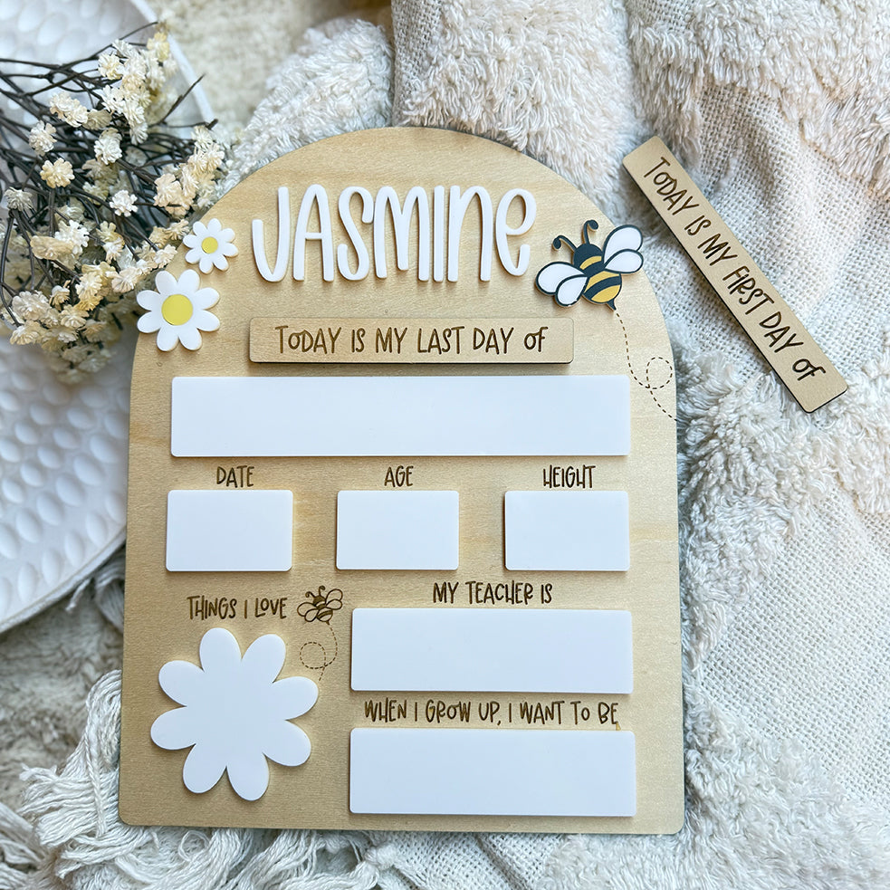 Celebrate the unforgettable moments of your child's school journey with this charming first-and-last day board. A beautiful way to honor their academic achievements. It gracefully connects the thrill of the first day with the proud reflection of the last, offering a nostalgic wrap-up to each school year. More than just a board, it’s a tribute to learning, growth, and the cherished memories your family creates along the way.