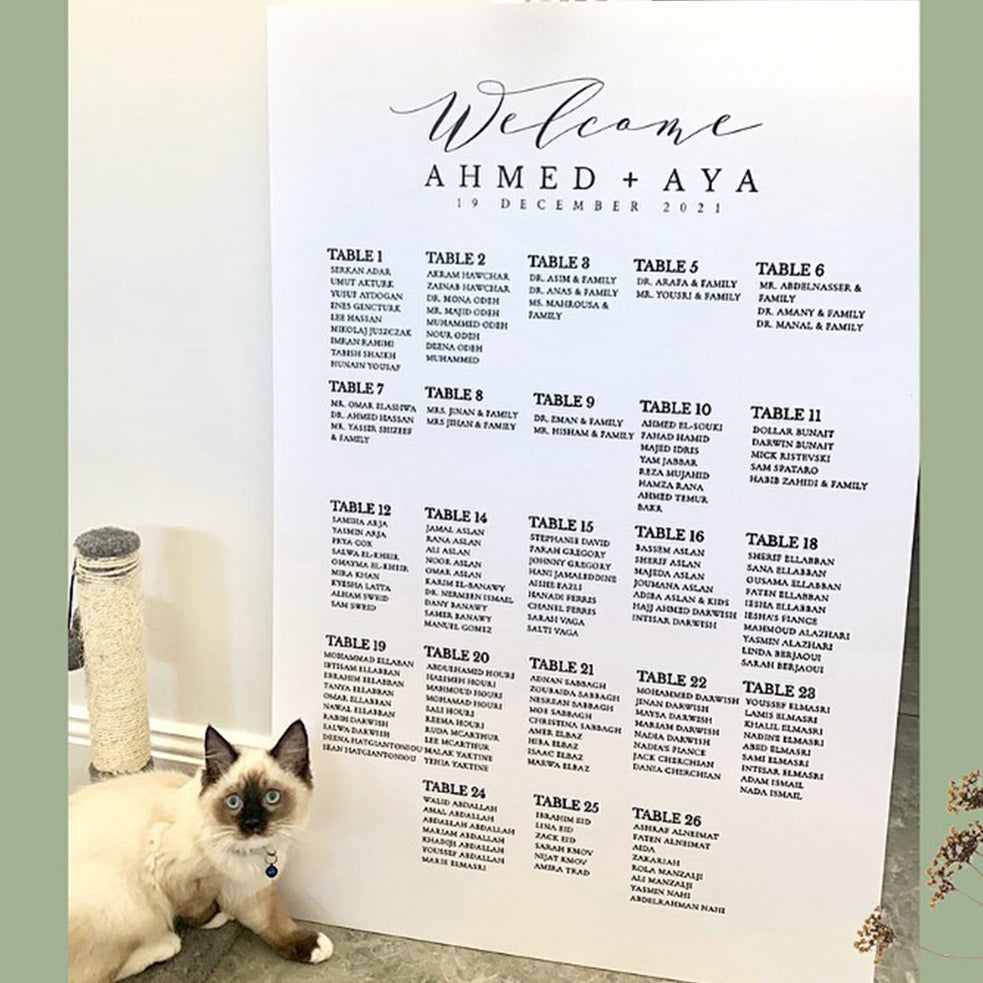 Our seating charts are perfect for your guests to quickly and easily find their place. Available in multiple sizes and options, we are sure we will be able to capture your idea for your event. Please upload a word document or excel spreadsheet with the correct information, date, table numbers, names, etc. Also let us know if you'd prefer this to be by alphabetical order, by last name or by group tables and we will send you a mockup for confirmation.